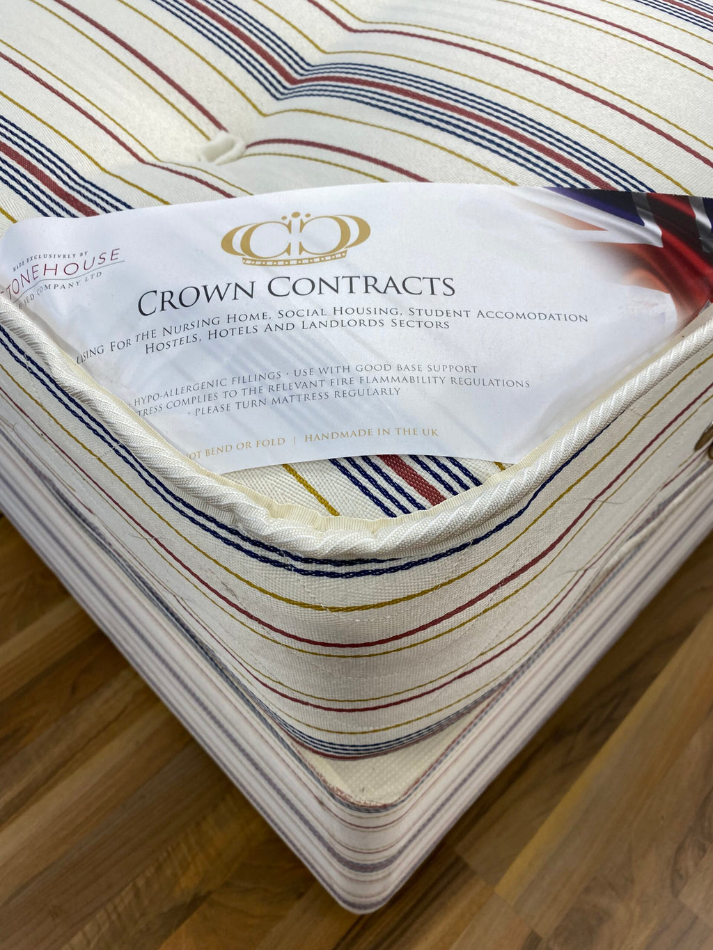 Quilted & tufted contract mattress Open coil spring unit 13.5 gauge Wire rod edge 6 gauge Several layers of polypropylene & fibre bonded fillings Additional fibre bonded pad layer Firmness 7 (rated 1 to 10, 10 being firmest) Certified CRIB 5 flame retardant Loxley cotton stripe fabric + wool safe barrier